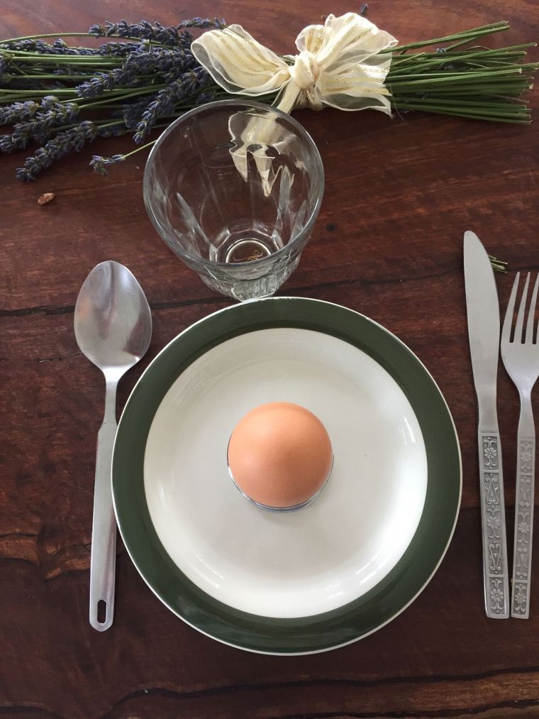 fork, cutter, spoon, plate, glas and egg